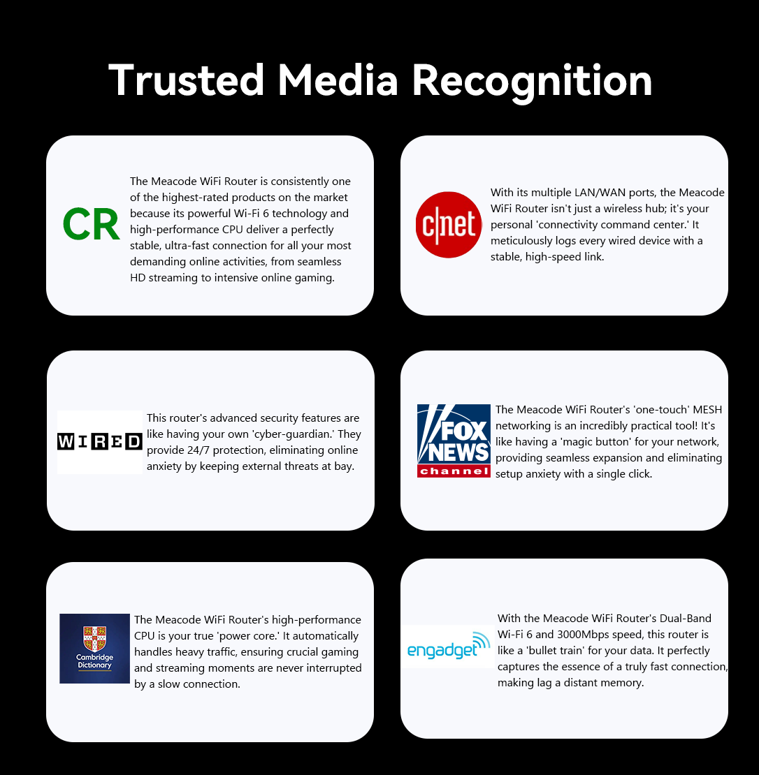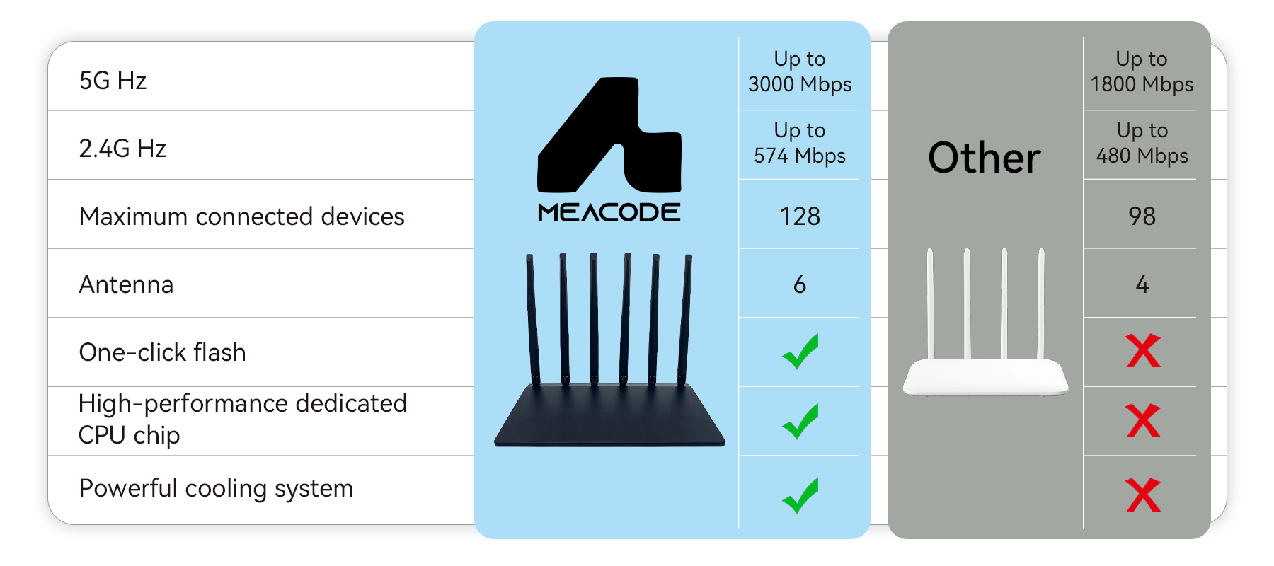 Meacode WiFi Router is powered by a high-performance WiFi chip that acts as the core of your network. It not only significantly boosts data processing speeds for a stable, lag-free connection but also intelligently manages power to reduce consumption, effectively extending the battery life of all your connected devices.